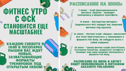 🏋️ В гродненских Пышках проходят открытые тренировки — к проекту присоединились фитнес-клубы Гродно Каждую субботу в 10:00 в лесопарке Пышки проходят тренировки на свежем воздухе в рамках проекта «Фитнес-утро с Физкультурно-спортивным клубом» (ФСК). В июне к программе присоединились и гродненские фитнес-залы, благодаря чему расширился перечень форматов занятий. Расписание тренировок на июнь: 👟7 июня — тренировку в формате кроссфит проведёт клуб функционального фитнеса «Брутал». Программа включает...