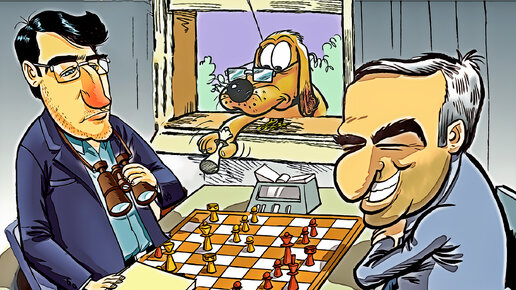 Играют Гарри Каспаров с Владимиром Крамником в шахматы. У Каспарова позиция ужасная, но сдаваться и проигрывать явно не хочется. Вот он грустно смотрит в окно и видит там собачку....