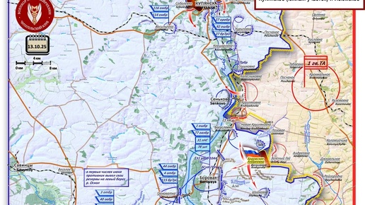 Короткая сводка с фронта за 13 октября 2025 года ВС РФ продолжают действия по ликвидации Боровского выступа. В конце прошлого месяца активными действиями на левом фланге было расширено южное основание этого участка на линии Карповка – Шандриголово - Дерилово, где готовится плацдарм для подрезания этого основания ударом направлением на н.п. Рубцы. (Карта 1.) Сейчас активные действия ведутся на правом фланге (северный фас выступа). Вчера был освобожден н.п. Боровская Андреевка (49°24′34″с.ш. 37°43′51″в...