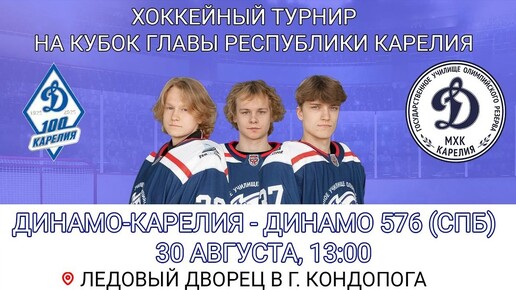 С 28 по 30 августа в Кондопоге состоится турнир на Кубок Главы Карелии по хоккею. В Ледовом дворце города встретятся три команды: «Динамо-Карелия» (Кондопога), «Арктика» (Мурманск) и «Динамо 576» (Санкт-Петербург). Главным событием выходных станет матч между «Динамо-Карелия» и петербургским «Динамо 576». Он пройдет 30 августа в 13:00 и станет завершающей игрой соревнований. После нее состоится церемония награждения победителей по итогам трехдневного турнира...