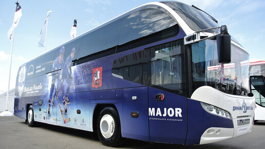 Привет! Сегодня мы узнаем на каких автобусах передвигаются по выездным матчам и тренировочным сборам команды российской суперлиги по хоккею с мячом. На самом комфортабельном автобусе среди всех команд лиги, бороздят просторы нашей страны столичные Динамовцы. Их автобус Neoplan Cityliner выполнен в клубных цветах, а в центре ливреи изображены хоккеисты клуба. На автобусе Scania ЛиАЗ Круиз выезжают на матчи хоккеисты ульяновской Волги. На задней части автобуса изображена эмблема клуба (правда, уже старая)...