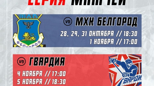 Дорогие болельщики, готовьтесь к захватывающему времени на льду! Впереди первая домашняя серия матчей нашей команды "Прогресс" в ЛДС "Глазов Арена". Не пропустите возможность поддержать наших ребят и стать частью яркой хоккейной атмосферы! 📌 Расписание матчей: - 28 октября: "Прогресс" - МХК "Белгород" (18:30) - 29 октября: "Прогресс" - МХК "Белгород" (18:30) - 31 октября: "Прогресс" - МХК "Белгород" (18:30) - 1 ноября: "Прогресс" - МХК "Белгород" (17:00) - 4 ноября: "Прогресс"...