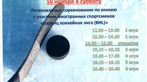 В ближайшую субботу, 10 ноября, в Апатитах по адресу: ул.Ленина 34, пройдут игры по хоккею с шайбой, по программе региональных соревнований "Баренц хоккейной лиги (BHL)". В этот день на льду встретятся 6 команд из Мурманска, Кировска, Оленегорска, Никеля, Финляндии и Норвегии...
