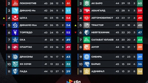 🔥🇷🇺 Турнирная таблица КХЛ на данный момент