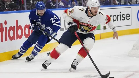 Канадский ХК Торонто Мейпл Лифс сыграл с американским ХК Флорида Пантерз в хоккей на льду в рамках розыгрыша Кубка Стэнли НХЛ в 1/4 финала 15-го мая в 02:00 по Москве и Санкт-Петербургу. Матч завершён. Игра прошла под диктовку хоккеистов Флориды, как будто это они были хозяевами льда. В 1-м периоде на 14-ой минуте Аарон Экблад открыл счёт. Во втором периоде Дмитрий Куликов на 26-ой минуте удвоил преимущество в счёте американцев. Для справки, Дмитрий Владимирович Куликов (род. 29 октября 1990, Липецк) — российский хоккеист, защитник клуба НХЛ «Флорида Пантерз»...