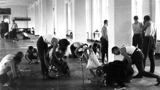 1. Михаил Бородин поделился: "Стёклами снимали старую мастику, затем вымывали с щёлочью, куски разводили в воде, всё насухо вытирали, затем наносили мастику, которую перед этим варили на улице… Старшина за шеф повара! И тут начинается натирание " Машкой " , на которую ещё сажали бойца. Полы блестели, как лаком покрыты. А все эти уборки в умывальнике , где краны в ряд из одной трубы и в туалете , вход в казарму , это на совести дневальных… Казарма 3-х этажная , если засор канализации , приезжала...
