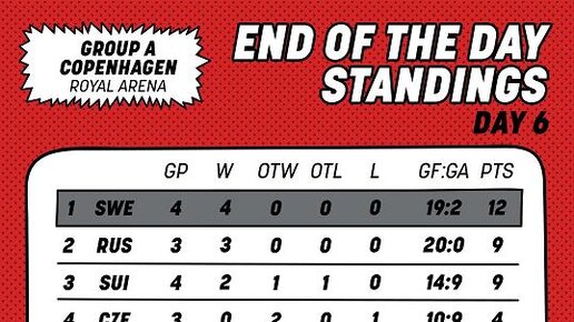 Турнирная таблица чемпионата мира по хоккею в Дании, день 6