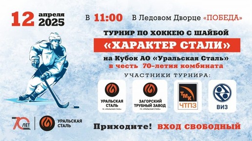 Комбинат «Уральская Сталь» (с Загорским трубным заводом входит в группу компаний «Уральская Сталь») проводит турнир по хоккею между любительскими командами. Торжественное открытие 12 апреля в 11.00 в Ледовом дворце «Победа». Между собой сыграют команды новотроицких металлургов «Уральская Сталь», подмосковных трубопрокатчиков «ЗТЗ», челябинских «ЧТПЗ» и екатеринбургских «ВИЗ». Хоккеистам предстоит сыграть друг с другом в ходе четырех поединков. Торжественное закрытие мероприятия и награждение победителей состоится в этот же день после финальной игры...