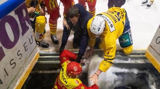 В Швейцарии два хоккеиста провалились под лёд после жесткого силового приема!