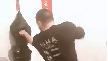 Залы пока закрыты. Работать по воздуху скучно. Вот такую грушу я сделал из того, что дома под рукой: старая куртка, подушка, резинки. На самодельной груше можно отрабатывать удары руками под разными углами...