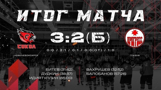 Новочебоксарский «Сокол» со счетом 3:2 взял верх над глазовским «Прогрессом» в повторном матче в рамках регулярного чемпионата Национальной молодежной хоккейной лиги. Судьбу встречи в Новочебоксарске выявила серия буллитов. Два гола в «Сокол» провел во втором периоде, их авторами стали Антон Битев (32-я минута) и Даниил Дудкин (39)...