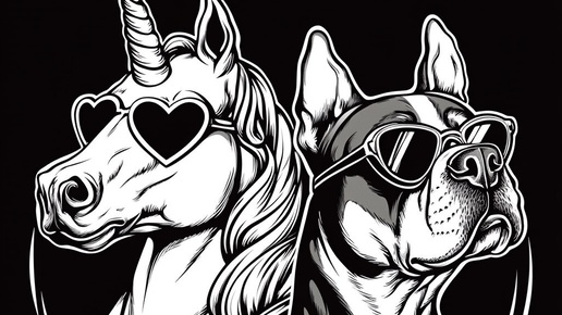 Создано на основе запроса: a logo for a unicorn horse queen witch horse and a purebred boxer dog, they stand in relief, back to back, they look like they might belong in a nineteen fifties film noir detective agency, the unicorn wears heart shaped spectacles, the dog wears a heart shaped detective's badge --- Автоперевод: Логотип...