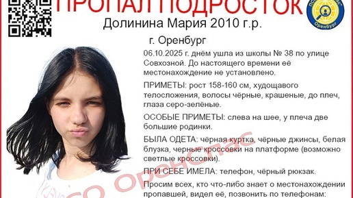 В Оренбурге снова ищет 15-летнюю Марию Долинину. Ранее она уже пропадала. О поисках сообщили в ПСО «Оренспас». Подросток ушла из школы №38 на улице Совхозной 6 октября и с тех пор не выходила на связь. Девушка ростом около 160 сантиметров, худая. У нее крашеные черные волосы до плеч и серо-зеленые глаза. На левой стороне шеи, ближе к плечу, видны две крупные родинки...