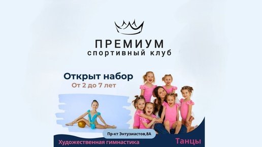 Заводской район продолжается набор в секции «художественная гимнастика» и «танцы»! Спортивный клуб «ПРЕМИУМ»💎 📍Проспект Энтузиастов, 8А У нас есть ещё много направлений для детей и девушек, также есть репетитор для учащихся начальных классов, подробнее у нас в канале🤫 💃Танцы 🔹Младшая группа 2-4 года 🔹Средняя группа 5-7 лет 🩰Художественная гимнастика 🔹Группа...