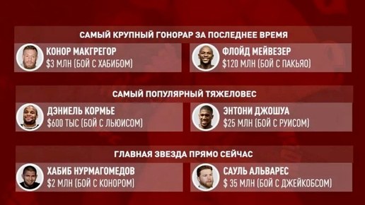Боксеры и футболисты стабильно входят в списки самых высокооплачиваемых спортсменов мира, тогда как бойцы UFC, за редким исключением, получают значительно меньше. Например, в 2021 году Сауль Альварес заработал $88,6 млн, а Конор Макгрегор — $49,1 млн, причём большая часть его доходов пришлась на боксёрский поединок с Флойдом Мейвезером . В боксе нет единого монополиста — WBC, WBA, WBO и IBF конкурируют за лучших бойцов, что увеличивает их доходы. Как отмечает чемпион Дмитрий Бивол: «В боксе много промоутеров, поэтому они вынуждены предлагать боксерам лучшие условия...