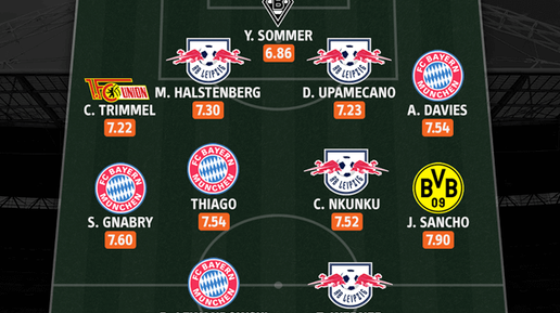 Вратарь: Ян Соммер (Боруссия Мёнхенгладбах) - 6,86 рейтинг Отличный сезон проводит Ян Соммер. Только футболисты «Бавария» и «РБ Лейпциг» (оба 26) пропустили меньше голов, чем Боруссия М (30) швейцарский голкипер сделал 89 спасений, чем любой другой вратарь Бундеслиги. Правый защитник: Кристофер Триммель (Юнион Берлин) - 7,22 рейтинг У 33-летнего правого защитника в этом сезоне есть семь передач, он хорошо играл в защите и активно помогал в атаке, при этом держал уровень не проходимости в свой линии обороны...