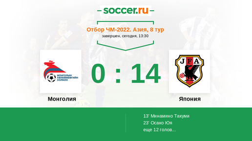 Япония разгромила Монголию со счетом 14:0. Это матч отбора на ЧМ-2022