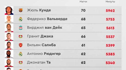 Лидеры 2024 года по игровому времени в футболе