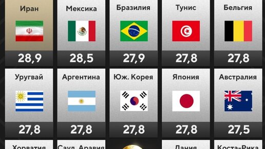Гана привезла самый молодой состав на ЧМ-2022 (средний возраст футболистов - 24,7 лет) Иран привёз самый возрастной состав на ЧМ-2022 (средний возраст футболистов - 28,9 лет) Самые дорогие сборные ЧМ-2022 Забавно, что стоимость Аргентины почти в два раза меньше, чем стоимость Англии или Бразилии. Но при этом многие считают Аргентину фаворитом (эффект Месси)...