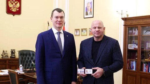 Дегтярев вручил Емельяненко удостоверение «Заслуженный тренер России»