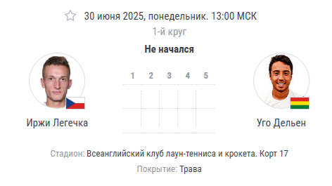 🎾 Полная аналитика матча Уимблдон-2025: Иржи Легечка (Чехия) vs Уго Дельен (Боливия)