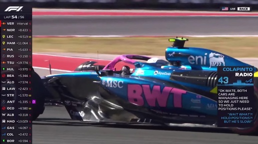 Вчера Альпин под конец гонки попросили своих гонщиков сохранять позиции, так как они работали над экономией топлива. Однако Колапинто, ехавший позади своего напарника, сказал, что Пьер слишком медленный, и сразу же обогнал его, оставив Гасли позади. Возможно, команда хотела, чтобы Франко защитил своего напарника от позади идущих, чтобы финишировать 17-м и 18-м, но в итоге Франко откинул эту идею и уехал, а Пьер спустился на последнюю строчку...