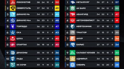 🔥🇷🇺 Турнирная таблица КХЛ по итогам вчерашнего игрового дня