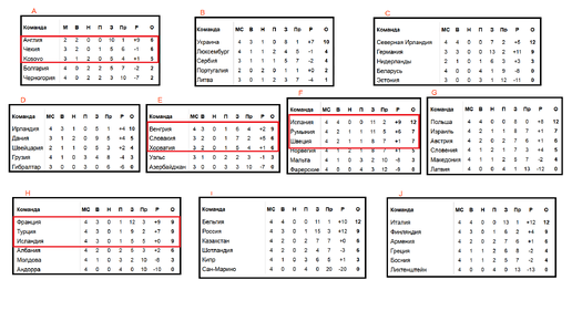 Чехи с последнего места ворвались на второе. В группе А - троевластие. Однако англичане сыграли на один поединок меньше, шансы болгар и черногорцев, у которых по два пункта, самые минимальные, и сыграно у них по 4 игры. Черногория имеет отрезок из 6 матчей без побед. А вот Косово не уступает никому вот уже 1,5 года. Напомню, выходят из каждой группы на чемпионат Европы напрямую первая и вторая команды таблицы. Косово и Чехия в сентябре выяснят, кто из них пойдет в отрыв, а Англии, скорее всего, на своем поле одолеет Болгарию, и перечеркнёт её попытки на выход...