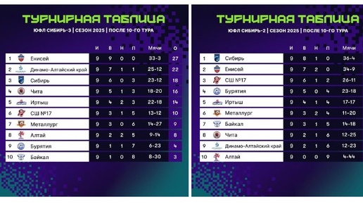 Сезона 2025 года 28 июля стартует второй круг Юношеской футбольной лиги (зона «Сибирь», U15, 2010 г.р. и U16, 2009 г.р.). По итогам первого круга команда улан-удэнской спортивной школы №6 U15 занимает девятое место. У них всего четыре очка после девяти игр (одна победа, одна ничья и семь поражений). Разница забитых и пропущенных мячей – 6-23. «Девятики» из U16 на четвёртом: 15 очков после девяти игр при разнице мячей 23-18 (пять побед и четыре поражения). А игрок команды Данила Косарев лидирует в споре бомбардиров, забив 13 голов...