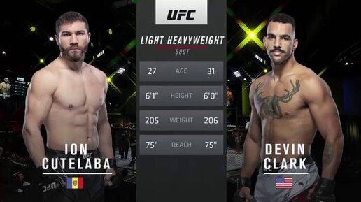 18 сентября. В Лас-Вегасе состоялся очередной турнир UFC FN 192. В со-главном поединке вечера в октагон вышли: Ион Куцелаба,представитель Молдавии, по боевому прозвищу "Молдавский Халк" (видимо из-за горы раскачанных мышц) и американец Девин Кларк . Соперники состязались в полутяжёлой весовой категории, до 93 кг. Карьера Иона Куцелабы в последнее время в UFC как-то не задалась, ведь из последних трёх поединков в двух он проиграл (оба раза досрочно) и один последний бой свёл вничью с Джастином Джейкоби...
