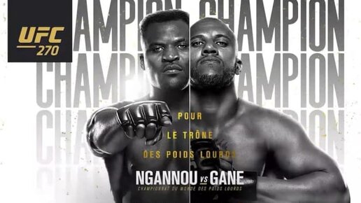 UFC 270: N’Gannou vs. Gane – предстоящий турнир Ultimate Fighting Championship, который планируется к проведению 22 января на арене «Honda Center», Анахайм, штат Калифорния. Главный Кард Фрэнсис Нганну vs Сирил Ган Брэндон Морено vs Дейвесон Фигередо Сергей Спивак vs Грэг Харди Коди Стэменн vs Саид...