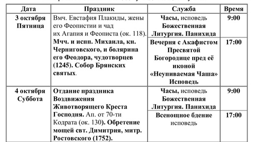 Расписание Богослужений на октябрь 2025 г