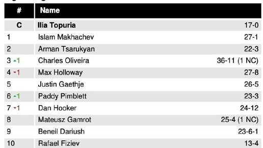 📝 Обновление рейтингов UFC ✅ Чарльз Оливейра вернулся в топ-15 P4P и стал 3-м в рейтинге лёгкого веса ✅ Маркус МакГи вошёл в топ-15 легчайшего веса 👊 В Лапах ММА