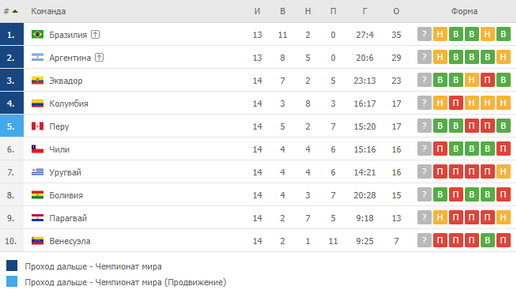 Здравствуйте, дорогие читатели! Сегодня мы разберёмся с ситуацией, сложившейся на отборочном туре ЧМ-2022 в Южной Америке. Бразилия и Аргентина Бразилия, как и Аргентина досрочно вышла на ЧМ-2022, так как у них уже нет шансов не попасть туда. Отбор состоит из 19 туров, по окончании игр отборочного этапа прямую путёвку на чемпионат мира получают 4 из 10 сборных, пятая отправляется в стыки со сборной другого континента. Как мы видим обе сборные получают прямую путёвку в любом случае. Эквадор и Колумбия Эквадор с треском провалился на отборе в 2018 году, заняв 8 место...