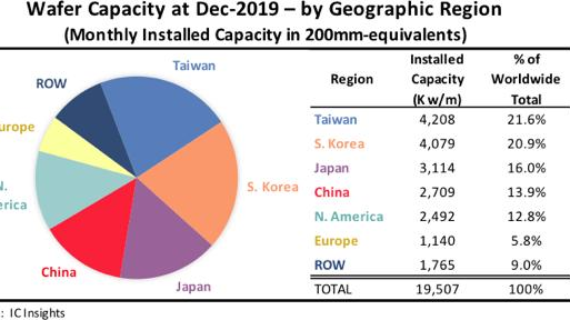 Прогноз по расширению мощностей Китая выведет страну на второе место в региональном рейтинге в 2022 году, уступая только Тайваню по размеру. В своем отчете global wafer capacity 2020-2024 IC Insights разбивает установленную в мире месячную емкость пластин по географическим регионам (или странам)...