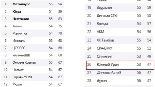 Однако разрыв с 16-ой строчкой большой – в активе ХК «Рубин», который сейчас там располагается, уже 64 очка после 55 матчей (на 17 очков больше относительно южноуральцев)...