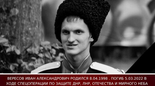 Вересов Иван Александрович родился 8.04.1998 - Погиб 5.03.2022. в ходе спецоперации по защите ДНР, ЛНР, Отечества и Мирного Неба над Россией на Украине в 2022 году. "Иван, как истинный казак, посвятил свою жизнь служению Отечеству...