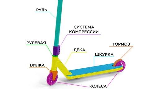 сначала разберём из чего состоит трюковой самокат и расскажем о каждым элементе отдельно. и так самокат состоит из: деки,колёс,тормоза,вилки,рулевой,компрессии,руля,грипс,заглушек,шкурки. начнём пожалуй с деки-одна из самый важных деталей при выборе самоката,я думаю не нужно подробно объяснять зачем она нужна) вобщем на деку крепится весь самокат,это как стержень. дальше шкурка-она нужна,чтоб при дропах или прыжках ноги не соскальзывали с деки. дальше идёт тормоз-он нужен для того,чтобы на больших скоростях вы не разложились на первом же повороте...