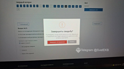 ЕКАТЕРИНБУБРГ - На официальном сайте престижной олимпиады «Изумруд», которую проводит Уральский федеральный университет для школьников, участники обнаружили странные и некорректные формулировки. В интерфейсе тестирования вместо стандартных терминов появлялись слова «чувак», «всё» и даже фраза «закончить свадьбу». Один из участников олимпиады сообщил, что во время прохождения онлайн-теста столкнулся с абсурдными надписями. Например, кнопка завершения теста была подписана как «завершить свадьбу», а поле для ответа сопровождалось словом «чувак»...