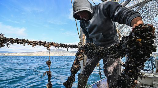 Эти рыбаки в шутку называют себя аргонавтами. Их самоходная платформа носит имя мифологического греческого корабля - "Арго". Маршрут судна, конечно, намного короче – всего 500 метров от берега, зато добыча ничуть не хуже, чем золотое руно - главные деликатесы черноморского побережья – устрицы и мидии. Вот так выглядит настоящий морской огород. А под этими буйками - грядки, своеобразная гирлянда. Натянут трос, к нему прикрепляются коллекторы, а на них цепляются мидии и начинают расти. Урожай можно собирать уже через 3 года...