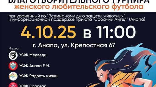 😎 Друзья! Мы приглашаем вас на Открытие ежегодного благотворительного турнира женского любительского футбола, который пройдет в Анапе! ⚽️💪 📅 4 октября 2025 года 🕚 Начало в 11:00 📍 г. Анапа, ул. Крепостная, 67 Турнир приурочен ко *Всемирному дню защиты животных* и пройдет в поддержку приюта «Собачий Ангел» 🐶👼 Вас ждут: ⚽ Игры женских футбольных команд: ЖФК Медведи, ЖФК Анапа F.M., ЖФК Радость жизни, ЖФК Спартак, ЖФК Движение, ЖФК Фемида РГСУ 🎤 Творческие выступления Варвары Беляевой и Марии Авербург 📸 Фотозона от Владиславы Герцог 🙂 Фотограф Сергей Эрфле ЖМИ СЮДА 👉 https://vk...