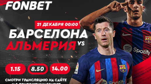 «Барселона» в предыдущем туре чемпионата Испании не смогла победить «Валенсию» (1:1) и теперь отстаёт от лидирующей «Жироны» уже на 9 очков! Команда Хави не имеет права на ошибку в заключительном матче года с «Альмерией», трансляцию которого в прямом эфире покажет букмекерская компания FONBET. Прямая трансляция «Барселона» – «Альмерия» в Казахстане Стартовый свисток арбитра прозвучит на «Олимпийском стадионе» 21 декабря в 00:00 по Астане, в ночь со среды на четверг. Смотреть матч «Барселона» – «Альмерия» бесплатно можно будет онлайн на сайте и в приложении FONBET...