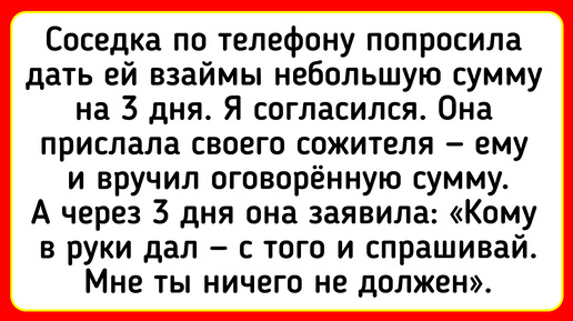 У жены есть знакомая — не близкая, не дальняя. Работали когда-то вместе. Постоянно занимает небольшие суммы — 500, тысячу. Отдаёт всегда, по-разному: быстро, иногда тянет. Недавно звонит. Мы обедали. Жена увидела, кто звонит, решила: поест, потом перезвонит. Но телефон звонил раз за разом. Жена не выдержала — ответила. Ну то же самое: просит перевести 500 рублей на карту. Хорошо. Жена положила трубку, говорит: сейчас доем и перекину, а то еда остывает. А телефон опять трезвонит. Взяла — а там с претензией:...