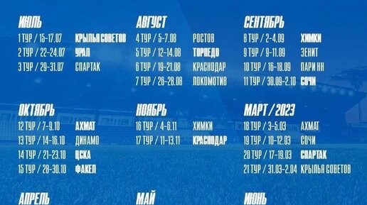 Новый сезон начнётся 15 июля. Зимняя пауза будет с 14 ноября по 3 марта. Она будет длительной из-за чемпионата мира в Катаре, который пройдет в ноябре—декабре этого года В осенью будет сыграно 17 туров. Пауза в сезоне стартует с 14 ноября, за неделю до старта ЧМ в Катаре. Матчи высшего российского дивизиона возобновятся 3–5 марта. Последний тур будет сыгран 3 июня. В первом...