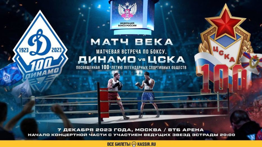 7 декабря в Москве Федерация бокса России совместно с Всероссийским физкультурно-спортивным обществом «Динамо» и Центральным спортивным клубом армии (ЦСКА) проведёт матчевую встречу между спортсменами обществ. На ринг «ВТБ Арены» выйдут ведущие российские боксёры, а почётными гостями станут известные и заслуженные спортсмены, деятели искусства, популярные музыкальные исполнители и блогеры. Событие носит название «Матч века». Оно посвящено 100-летнему юбилею «Динамо» и ЦСКА...