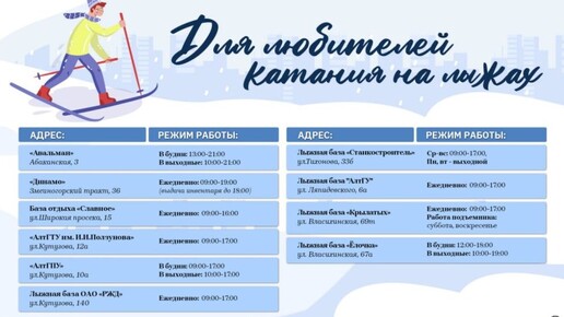 Новогодние каникулы – идеальное время, чтобы вырваться из дома и зарядиться бодростью на весь год. Барнаульцев и гостей города ждут катки, освещенные лыжни и хоккейные коробки Более десятка катков, лыжных баз и хоккейных коробок будут работать для жителей и гостей Барнаула в новогодние праздники. Списком, где можно активно провести выходные, поделились в мэрии краевой столицы. Любителей катания на коньках ждут как открытые площадки в разных районах города, так и крытые арены. Последние – идеальный вариант для тех, кто не готов зависеть от капризов погоды...