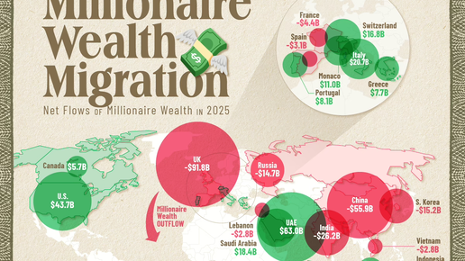 Из-за изменений в налогообложении богатства Великобритания, по прогнозам, увидит отток миллионерского капитала на сумму 91,8 миллиарда долларов, что почти в два раза больше, чем в Китае. (Кажется, чай с печеньками уже не спасает.) Индия, по прогнозам, займет третье место по оттоку капитала - 26,2 миллиарда долларов. ОАЭ с чистым притоком в 63 миллиарда долларов станут лидером по привлечению богатства благодаря нулевому налогу на доходы и благоприятному деловому климату. (Там просто знают, как заманить миллионеров...