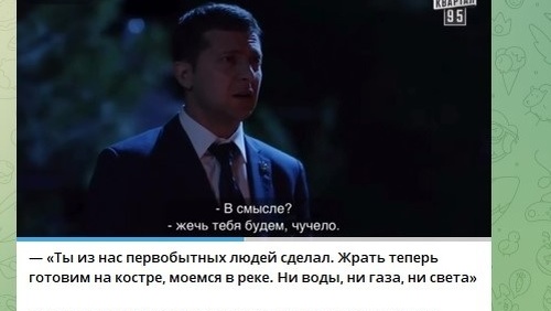 О том, что Киев будет замерзать, а самым популярным источником света в городе станет свеча, Владимир Зеленский знал давно. Киевляне вспомнили "кадры из прошлого" и в шоке делятся друг с другом. Речь идёт о кадрах из сериала "Слуга народа", где Владимир Зеленский сыграл роль президент Украины Василия Голобородько. В шокировавшей киевлян сцене Голобородько подходит к отцу, который жарит еду на костре и между ними завязывается следующий диалог: - Привет, папа. Ты прямо мысли мои читаешь. Я целую неделю хотел шашлык...