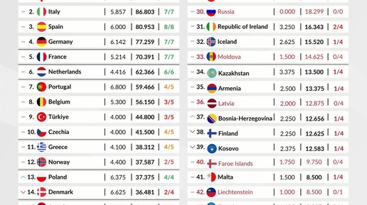 Таблица коэффициентов УЕФА после очередной еврокубковой недели.