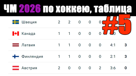 Привет, друзья. На чемпионате мира по хоккею завершился 5-й игровой день. Рассказываю о результатах. Напоминаю, что пора переходить на наш рутуб. Кто уже подписался, тот мо-ло-дец. Национальные команды Словении и Латвии сошлись между собой в рамках группового этапа. Соперники забросили семь шайб на двоих, а уверенную победу отпраздновали латыши. На точные броски Кристиана Рубинса, Анри Равинскиса, Дзиеркалса, Лочмелиса и Тралмакса словенцы ответили шайбами Махковеца и Грегорца. Латвия набрала шесть баллов и идёт на третьей строчке в турнирной таблице...